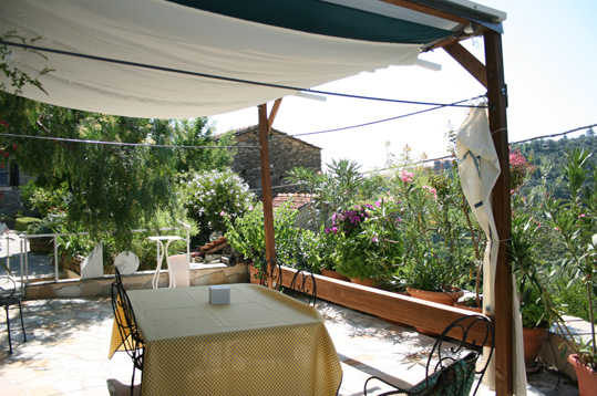 こんなに素敵なテラスで朝食を食べる間に蝶々やハチなど沢山飛んでいます。