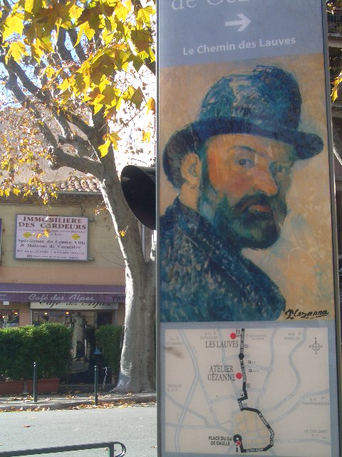 道の途中にセザンヌのアトリエ(かつての住いで今は美術館になっている)までの道順が彼の自画像の絵と共に記されています