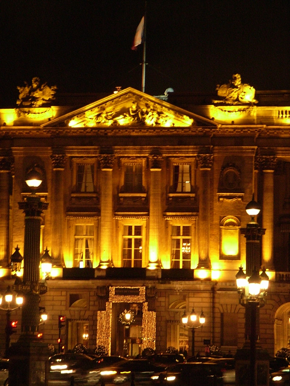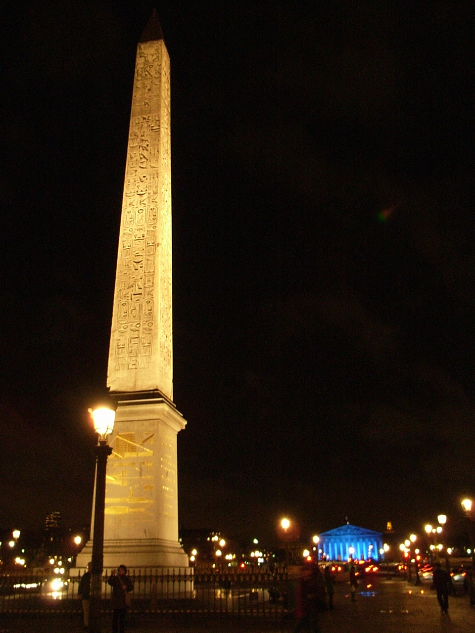コンコルド広場のオベリスクは、エジプト王よりシャルル10世に贈られたもの。そして、奥はブルーのライトアップされた国会議事堂。