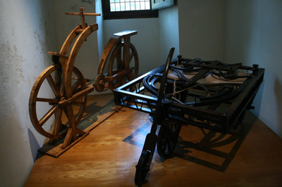 史上初の戦車、自転車、旋回橋、水力学、外車千、飛行機の元祖ともいえる空飛ぶ機械、ヘリコプターが展示されています。