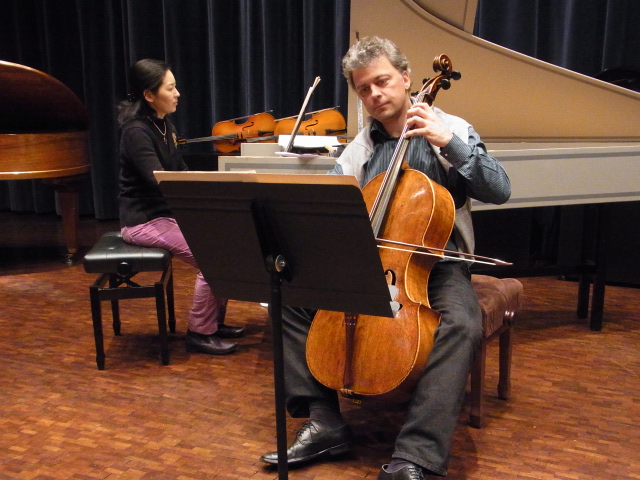 今回もお馴染のラファエル&パスカル夫妻とのトリオで、行きの電車の中で1日目の午後から早速6歳ー10歳くらいまでの子供たちにチェロ、バロックチェロ、ピアノ、チェンバロを楽器とスタイルと共に紹介する公開講座が2クラスもあることを知り、が~~ん。というか