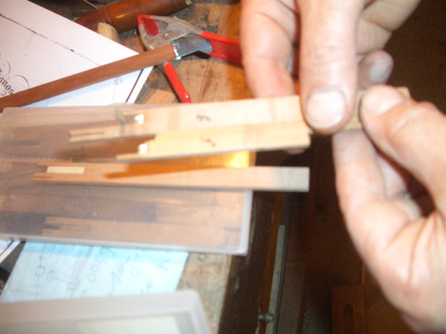 チェンバロの音を出すジャックと言われる部分。鍵盤を弾くとこの木が上がり、その先に付いている*爪*のような部分が弦をはじく構造。