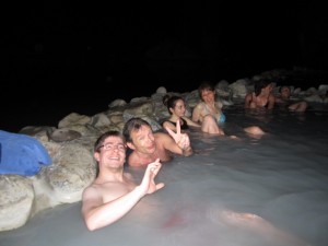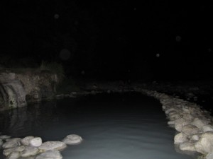 真っ暗闇の中、水の音と人の声だけが聞こえます。お湯の方へ入っていくと、何と暖かい!おお~~。バーデンバーデンなどの温泉も日本人には”ぬるすぎる”と聞きましたが、日本人にも程よい38度くらい?