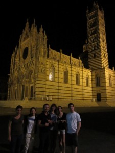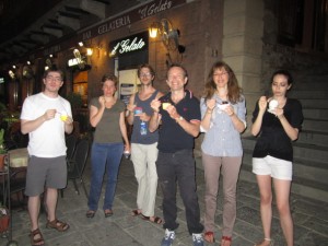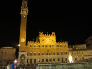 すでに11時過ぎだったにもかかわらず、やっぱりシエナにジェラートを食べに行こうということになり、また車で1時間。着いたら深夜過ぎでしたが、有名な広場は夏の観光客で賑わっていました。