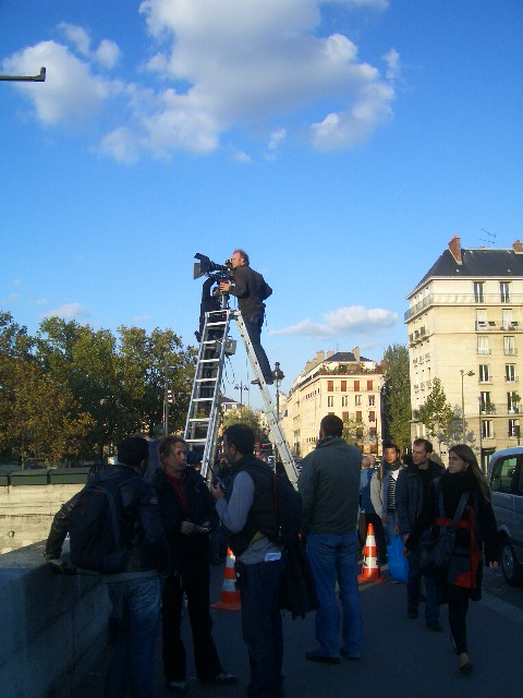 映画の撮影でしょうか。トランシーバーで連絡をするアシスタントがいる中、カメラマンはこんな高さで撮影