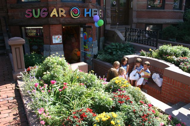 お菓子やサンの前で子供たちがきゃっきゃと言っていました。