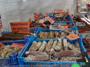 色々な種類のSaucisson.(ソーセージ)日本ではとても貴重なフランスのソーセージは一皿でも高いですし、日本に居るとあえて食べませんが、久しぶりに大量に見て、しかも4ユーロとかの安さにびっくり!フランスでは、お豆腐や油揚げ?みたいな感覚で常に卓上にワインとあるものなのではないでしょうか。