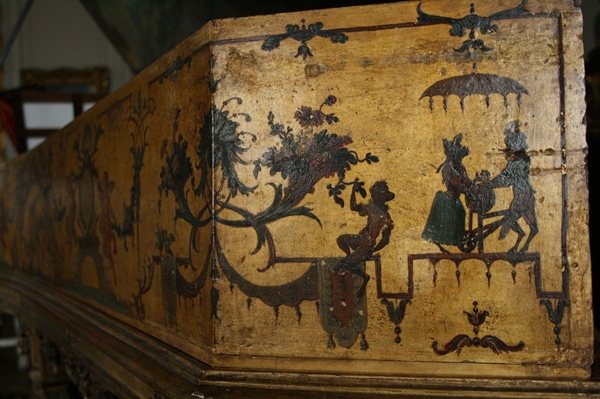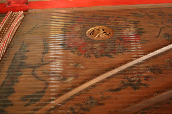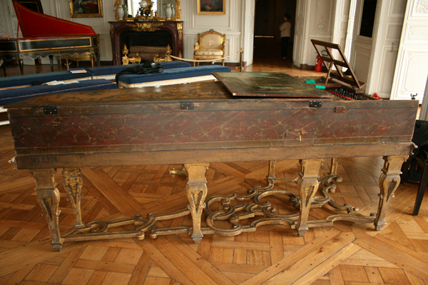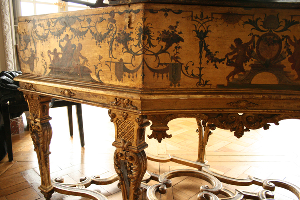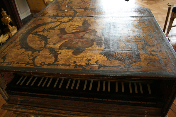 パリの楽器博物館にも同じ装飾画家(パリ)で仕上げられたルッカースがありますが、このヴェルサイユ所蔵の方は、金箔の後に黄色いニスを塗ってしまった様で(1700年代)色がきれいに出ていないのだそうです。少し剥がれた部分から良く見ると下に金箔のレイヤーがあるのが見えます