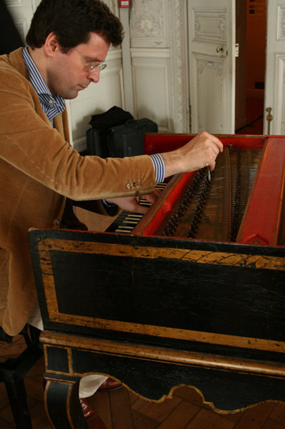 調律するメノとチェンバロ製作者のアラン・アンセルム