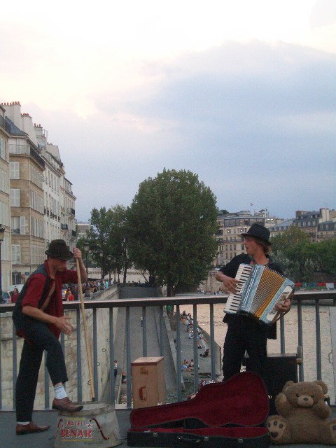 アコーディオンを弾きながらフランス語の歌を歌うお兄ちゃんと、隣でなんとモップの枝に1本のひもを繋げただけの、楽器(?!)でコントラバスの様に、伴奏していて弾いている二人が居た。何とも滑稽で、思わず、パシャリ!