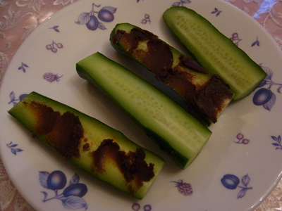 念願の試食!早速お味噌、梅を載せて頂きました。シャキシャキと水みずしくて美味しかったです。