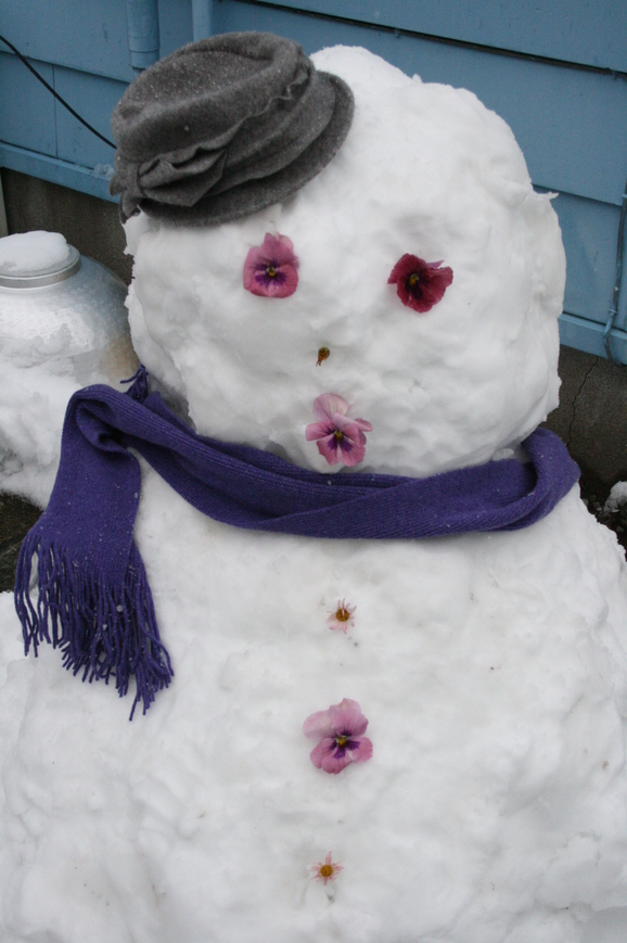 雪かきをしたついでに、【雪だるま】パンジーのお花で目鼻をしたけど、ちょっとブチャイク?!ちょっと、メイクが濃い女の子っぽい?!(笑