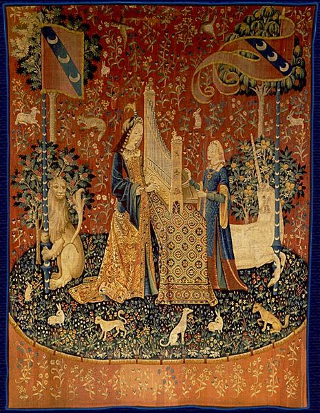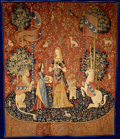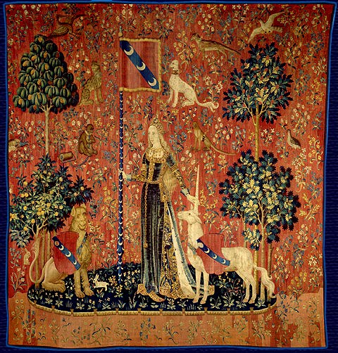 パリのクリニュー中世美術館にある、【五感】味覚、聴覚、視覚、嗅覚、触覚の五感と欲望をテーマにした有名な【貴婦人と一角獣】の6枚からなるタピストリーがありますね。