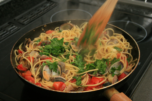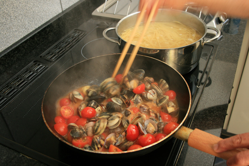 あさりの蓋が開いてくるまで炒めます。トマトとあさりのうま味が混ざって絶品のソースが出来ます。
