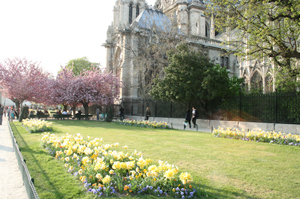 先週パリではとても良いお天気でノートルダム寺院の横には八重桜が満開でした。観光ボートも沢山の人達で賑わっています。