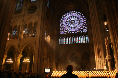 有名なバラ窓とミサをする司祭達。ミサ中にはノートルダム寺院の荘厳なオルガンが教会内に鳴り響きます。
