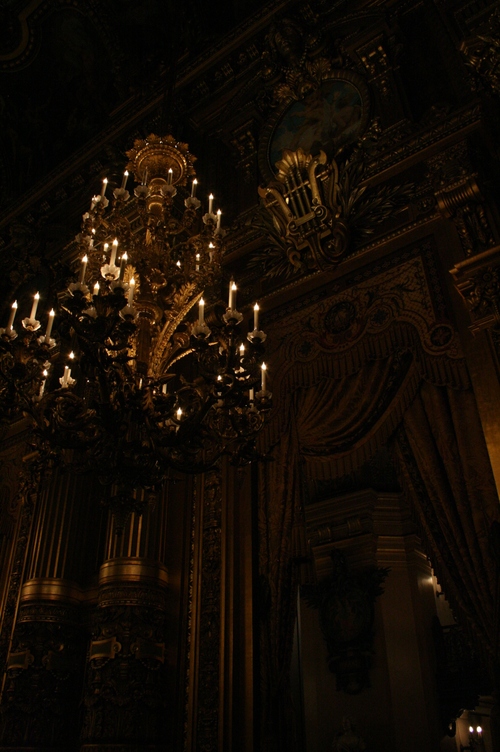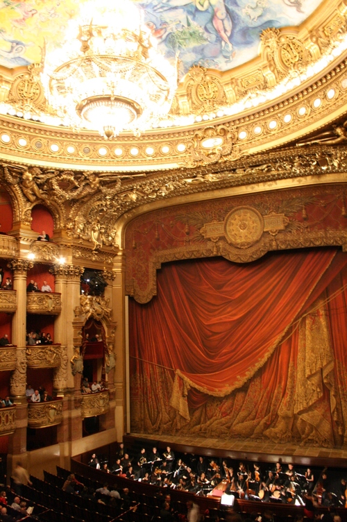 ブロードウェイのミュージカル【オペラ座の怪人】のストーリもこのパリ・オペラ座を元に作られたようです。このカーテンやシャンデリアがロンドンやN,Yのミュージカルでも再現されています。